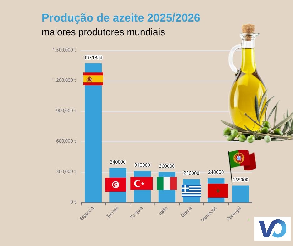Portugal será o 7º produtor mundial, com 160.000 a 170.000 t de azeite, ou seja, 10% abaixo da campanha 2024-2025.