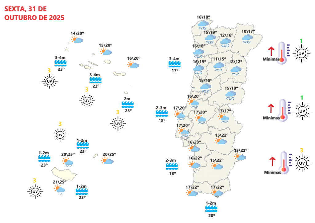 É provável que em alguns locais a Norte não pare, efetivamente, de chover ao longo de todo o dia, já tivemos algumas questões relacionados com o Halloween, e, de fato, não estará bom para as “bruxas” – pode ser que surja alguma aberta, mas não conte com isso