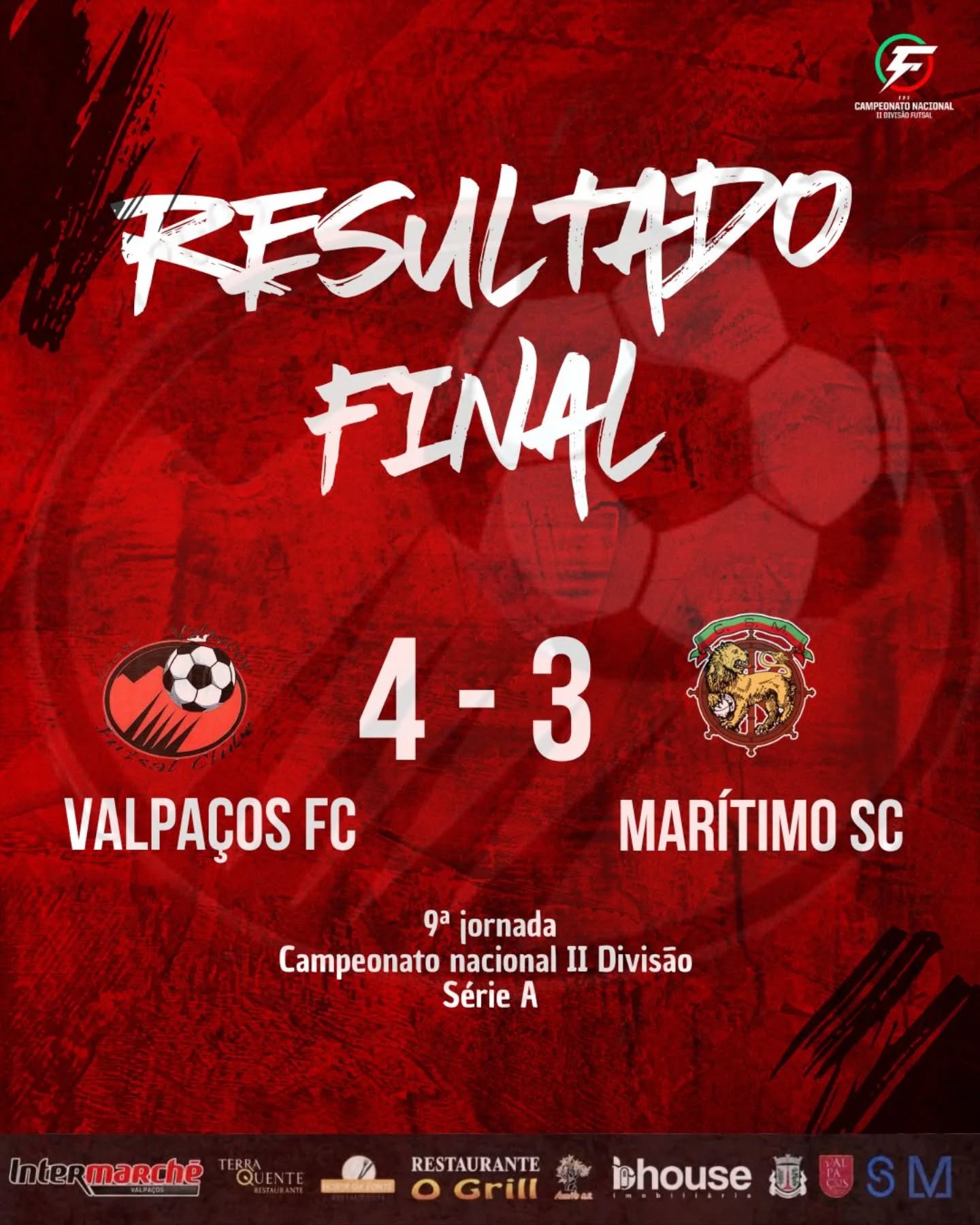 Terminou o jogo de Futsal entre o Valpaços Futsal Clube e o Marítimo SC com vitória para a equipa da casa por 4-3. Jogo a contar para a 9ª Jornada do Campeonato Nacional da 2ª Divisão – Serie A.