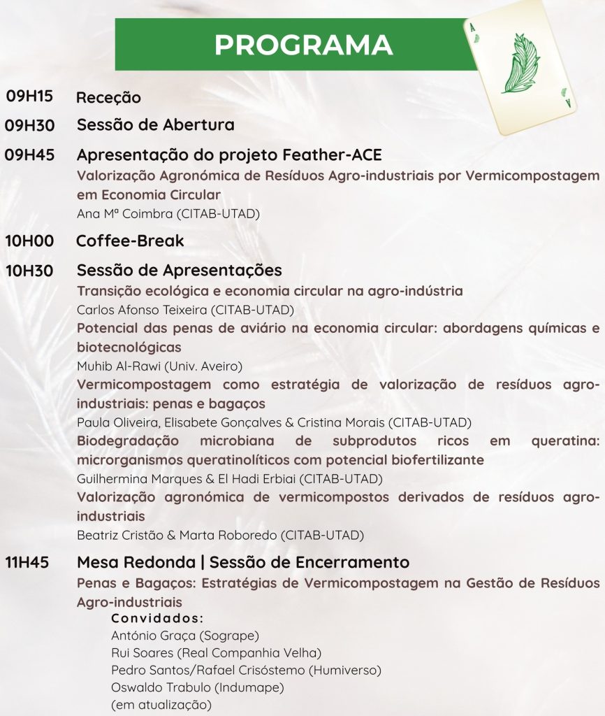 No âmbito do Projeto FEATHER-ACE, vai decorrer um workshop no próximo dia 11 de março, pelas 09:15h no UTAD-Universidade de Trás-os-Montes e Alto Douro, Auditório B0.01 (Blocos Laboratoriais), com organização do CITAB.