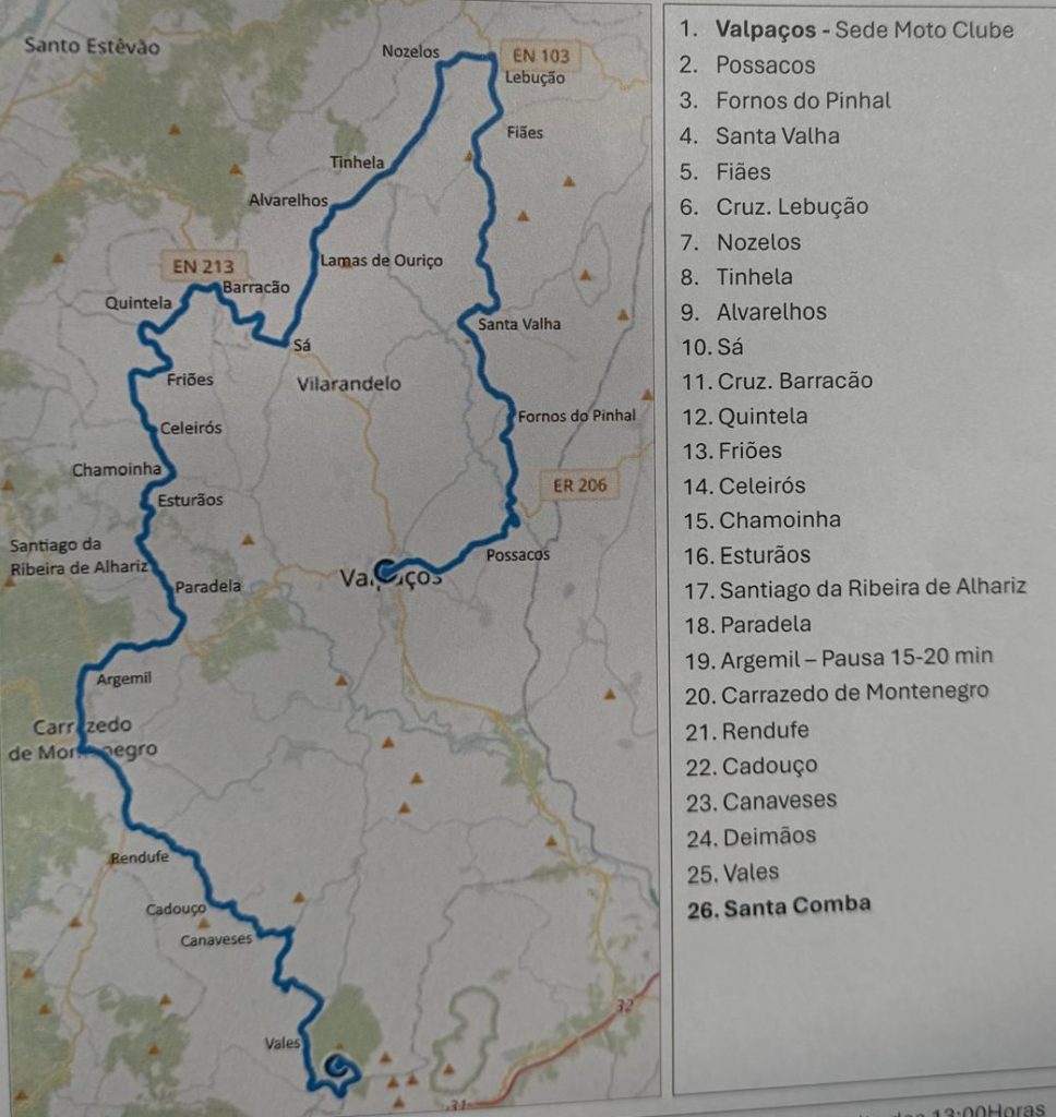O sol abrilhantou o dia, proporcionando um excelente passeio para que os 80 motociclos presentes percorressem cerca de 135kms, de vistas magnificas por terras do concelho de Valpaços. Um percurso recheado de paisagens deslumbrantes, estradas sinuosas (que aumentam a adrenalina), aldeias que recebem os motociclistas com um belo sorriso e uma camaradagem inigualável. Terminando com um almoço de companheiros no sopé da serra de Santa Comba.