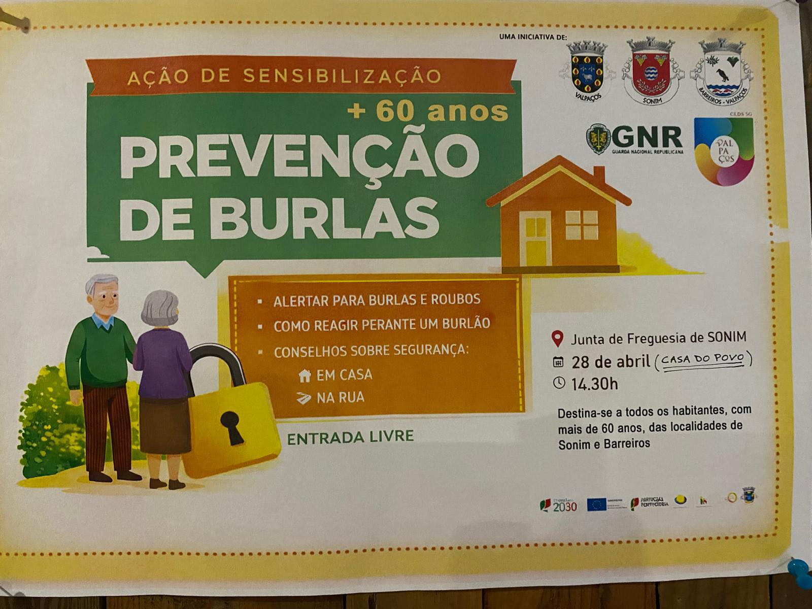 A Junta de Freguesia de Sonim e Barreiros, convida toda a população, especialmente os cidadãos com mais de 60 anos, a participar numa sessão de sensibilização dedicada à prevenção de burlas e roubos.